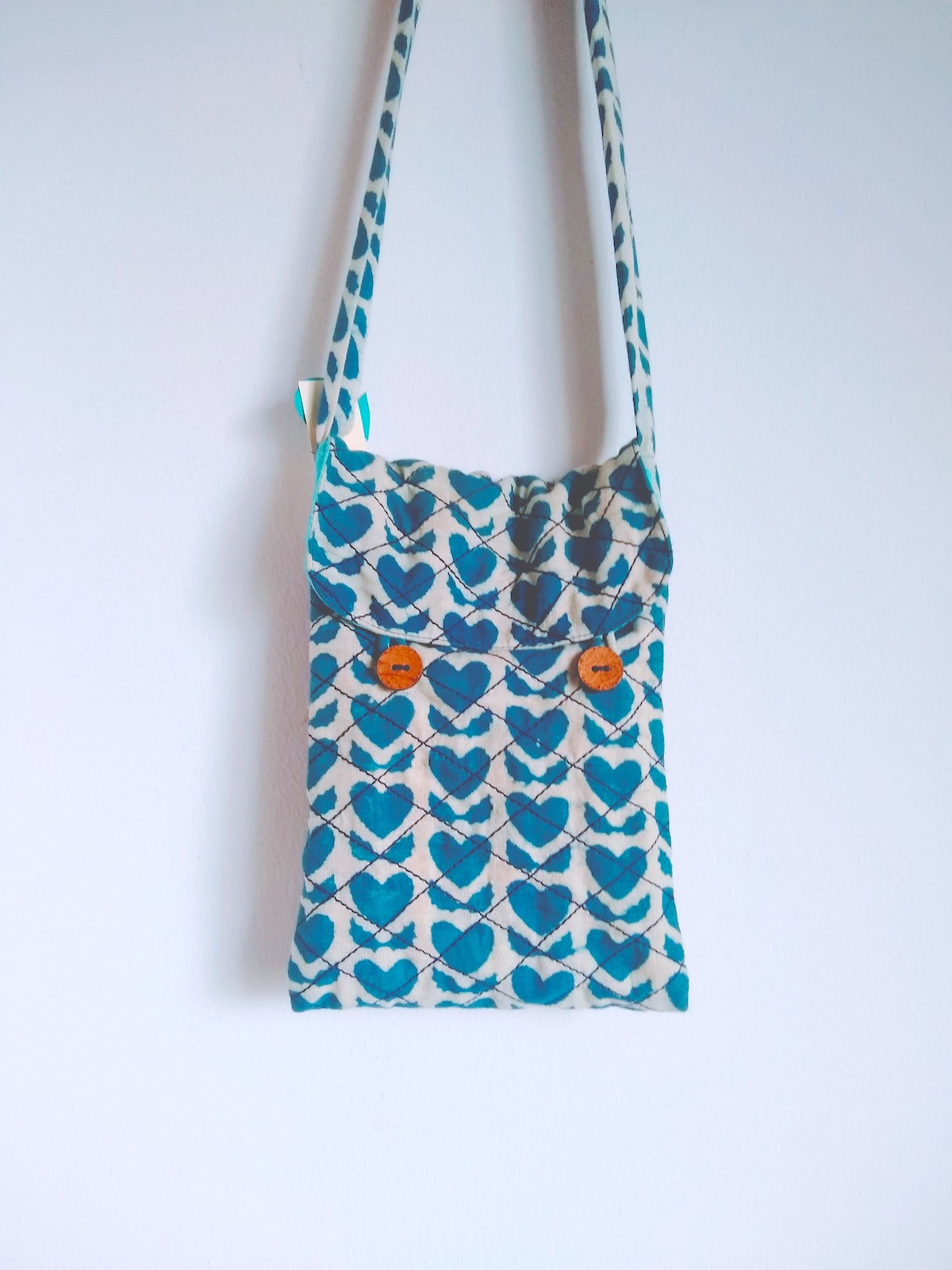- 6″ X 8.5″ Sling bag made of soft indigo heart print cotton