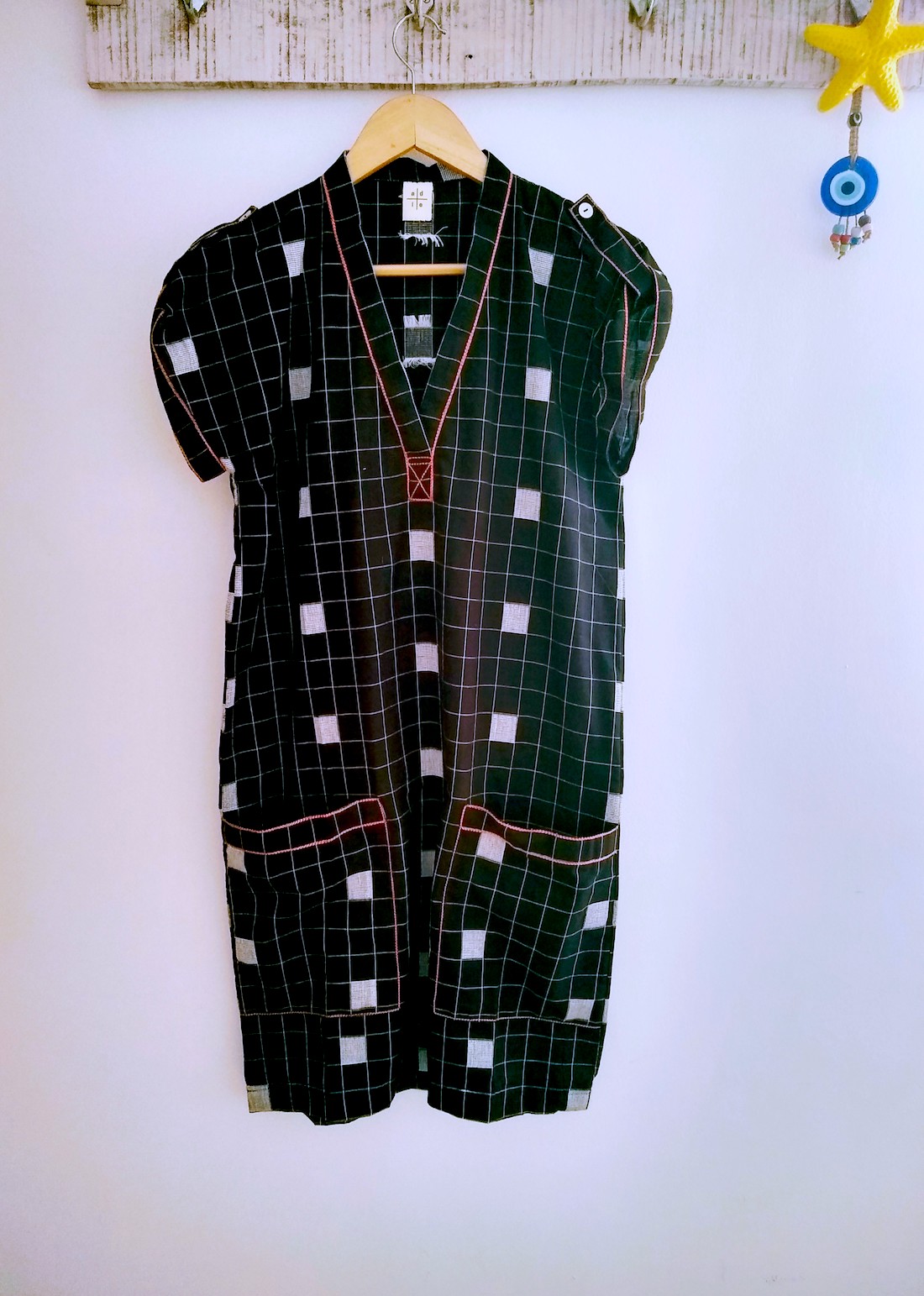 Checkered Shift Dress for that effortless vibe in a handloom cotton. Contrast orange pop details and patch pockets