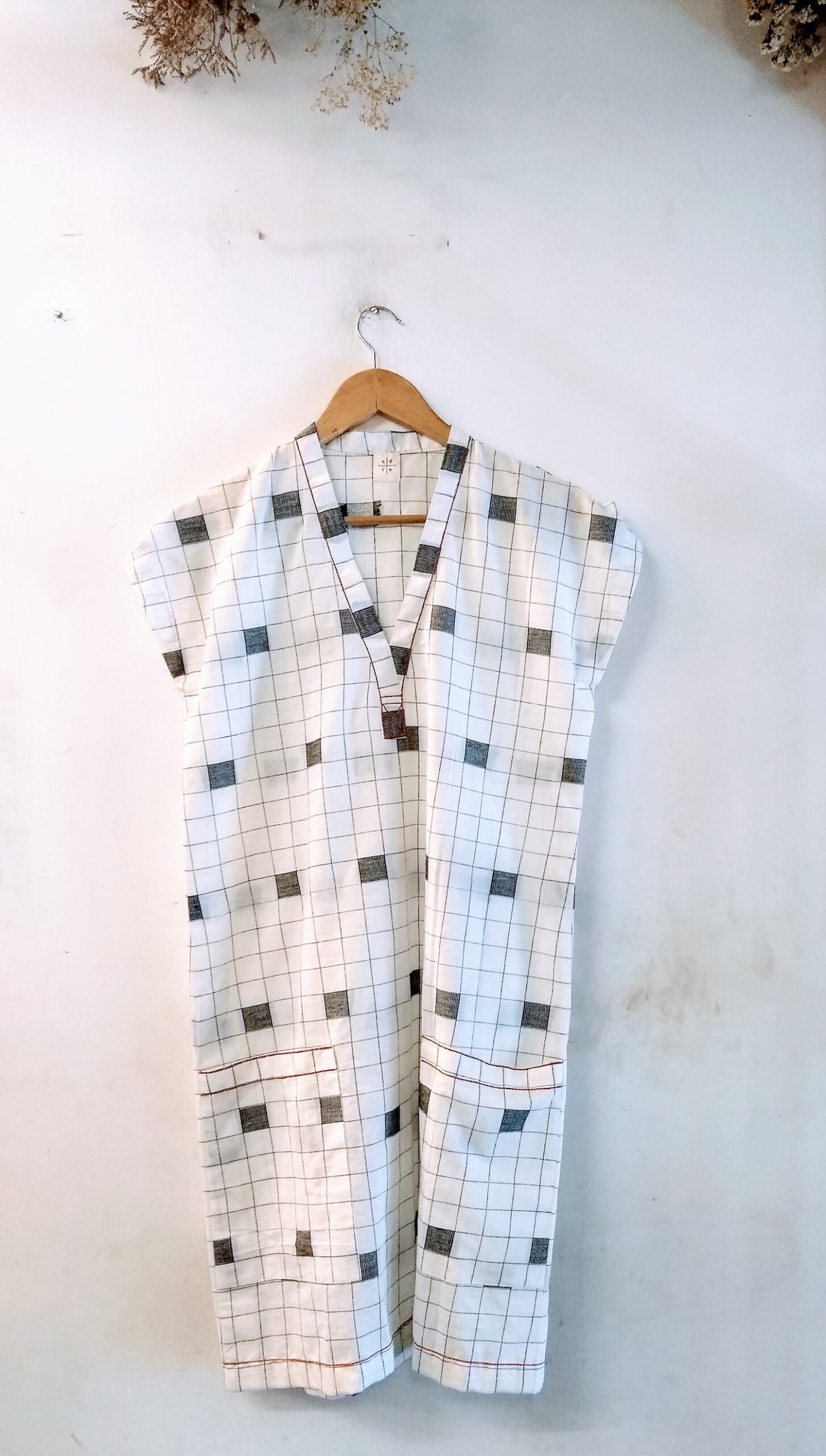 Checkered Shift Dress for that effortless vibe in a handloom cotton. Contrast orange pop details and patch pockets