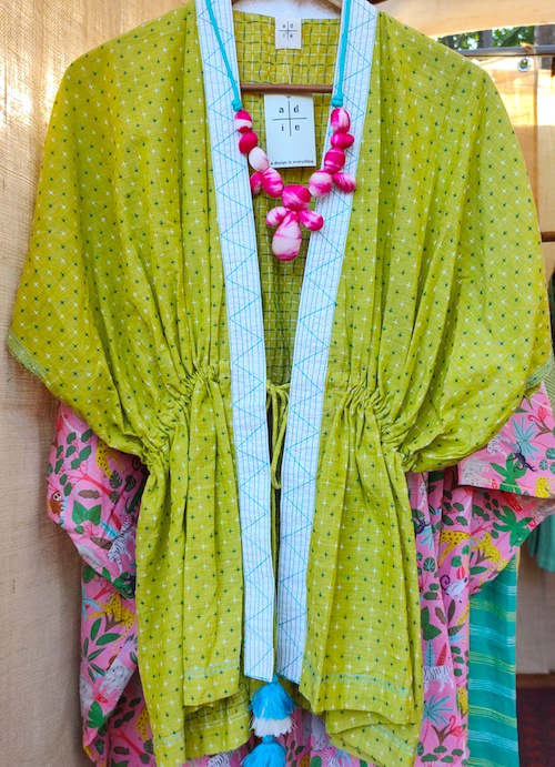 Citron Lime Kimono Drawstring Jacket as a layering piece with handmade tassels and multi thread stitch detailing. Layer it over a basic slip dress or comfort pants and our candy drop necklace for an effortless look