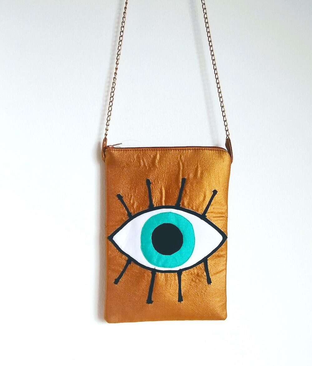 6″X8.5″ with a lightweight chain, foam cushion and evil eye patchwork