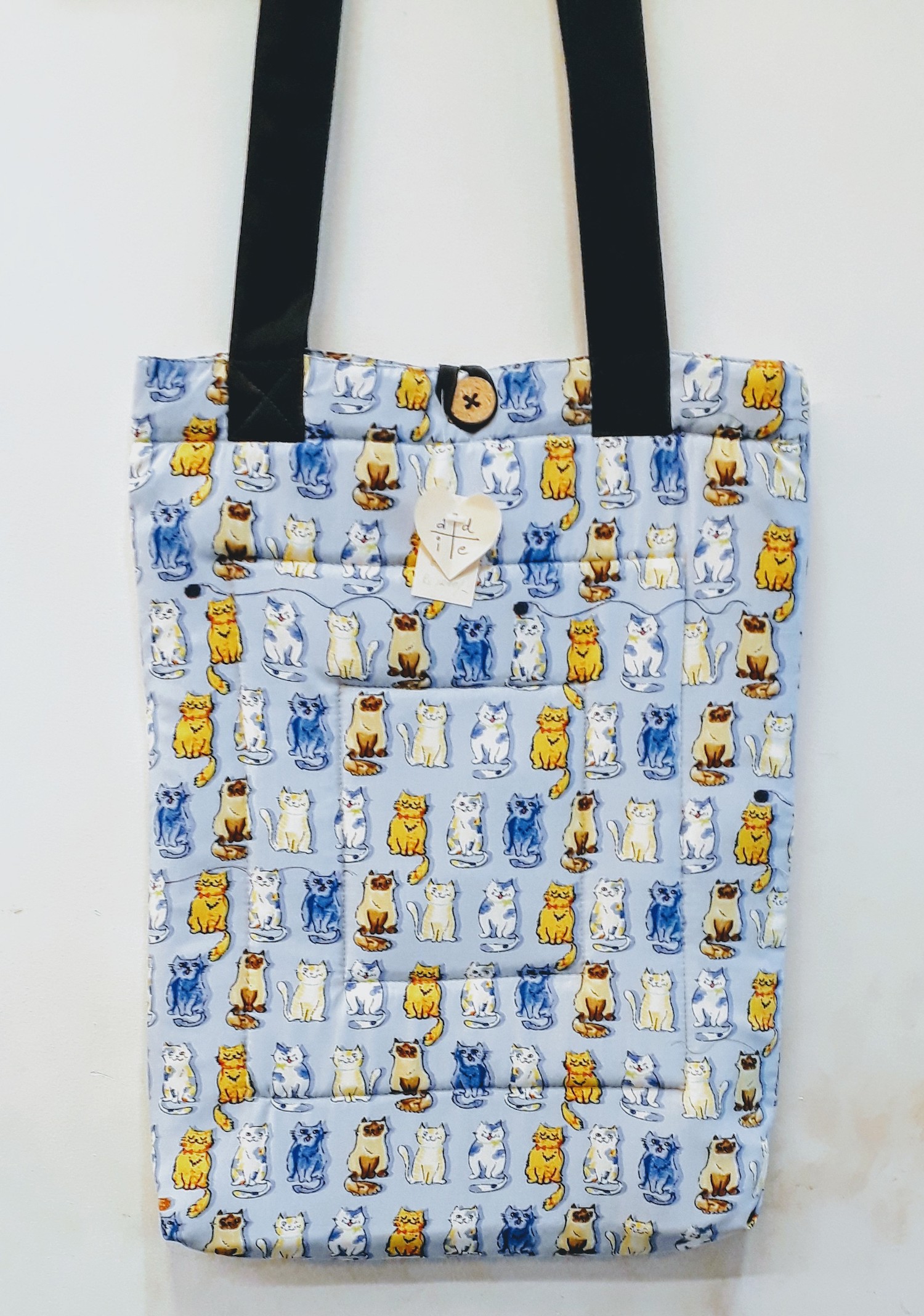 Kitty Tote Bag with a cat print cotton fabric. Purrfect bag with an additional foam cushion layer and wooden button closure