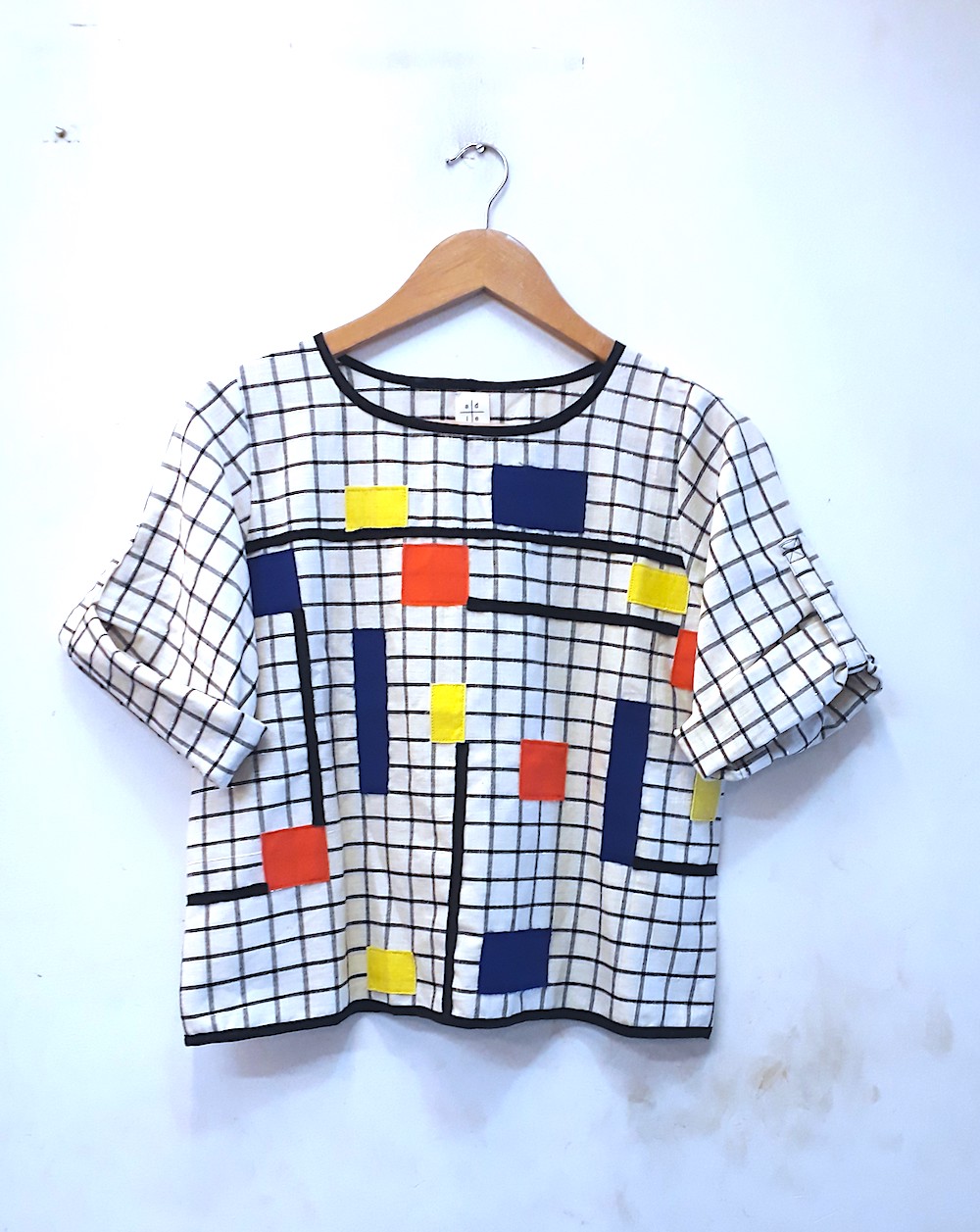 Mondrian Woven Tee inspired by the work of Piet Mondrian and the De Stijl movement which promoted an abstract style of art based on the geometry of the straight line, the square , the rectangle combined with the use of pure primary colors with black and white.