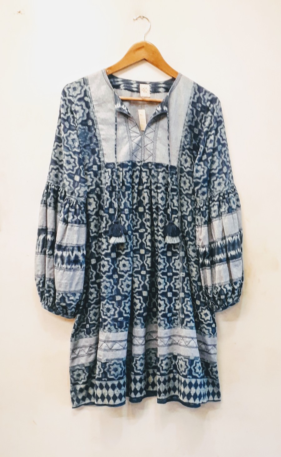 Moorish Motif Indigo Folk Dress  with bohemian vibes with handmade tassels & geometric stitch detailing. Fabric mix of Indigo polka and chambray.