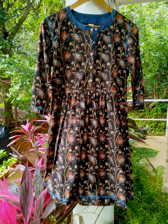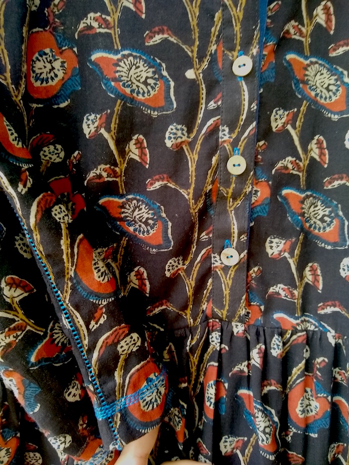 Wildflower Poppy Dress in an earthy colour palette with contrasting details. Easy to wear gathered waist dress with a functional button front