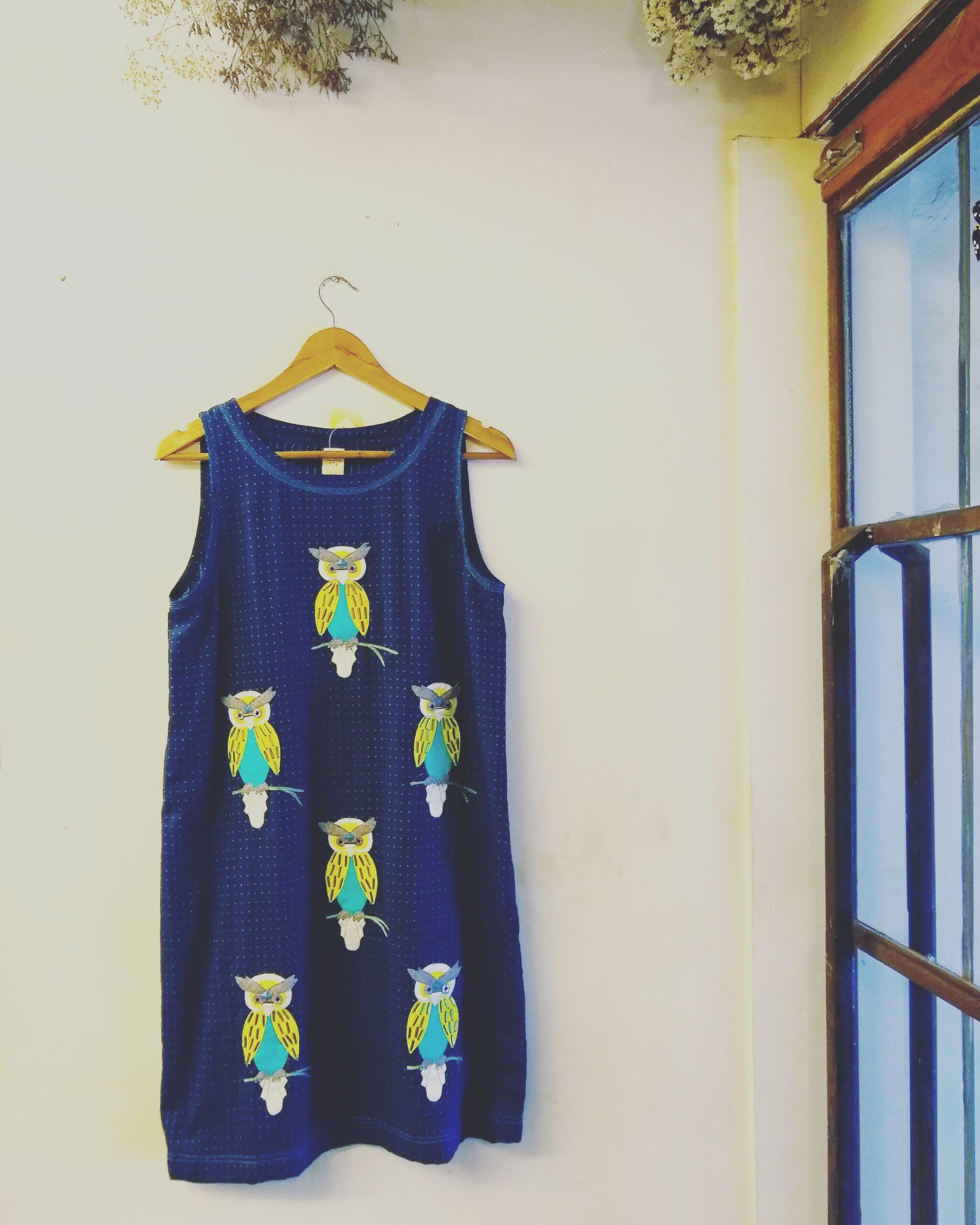 Quirky embellished owl patchwork dress. Base fabric is 100% cotton dobby
